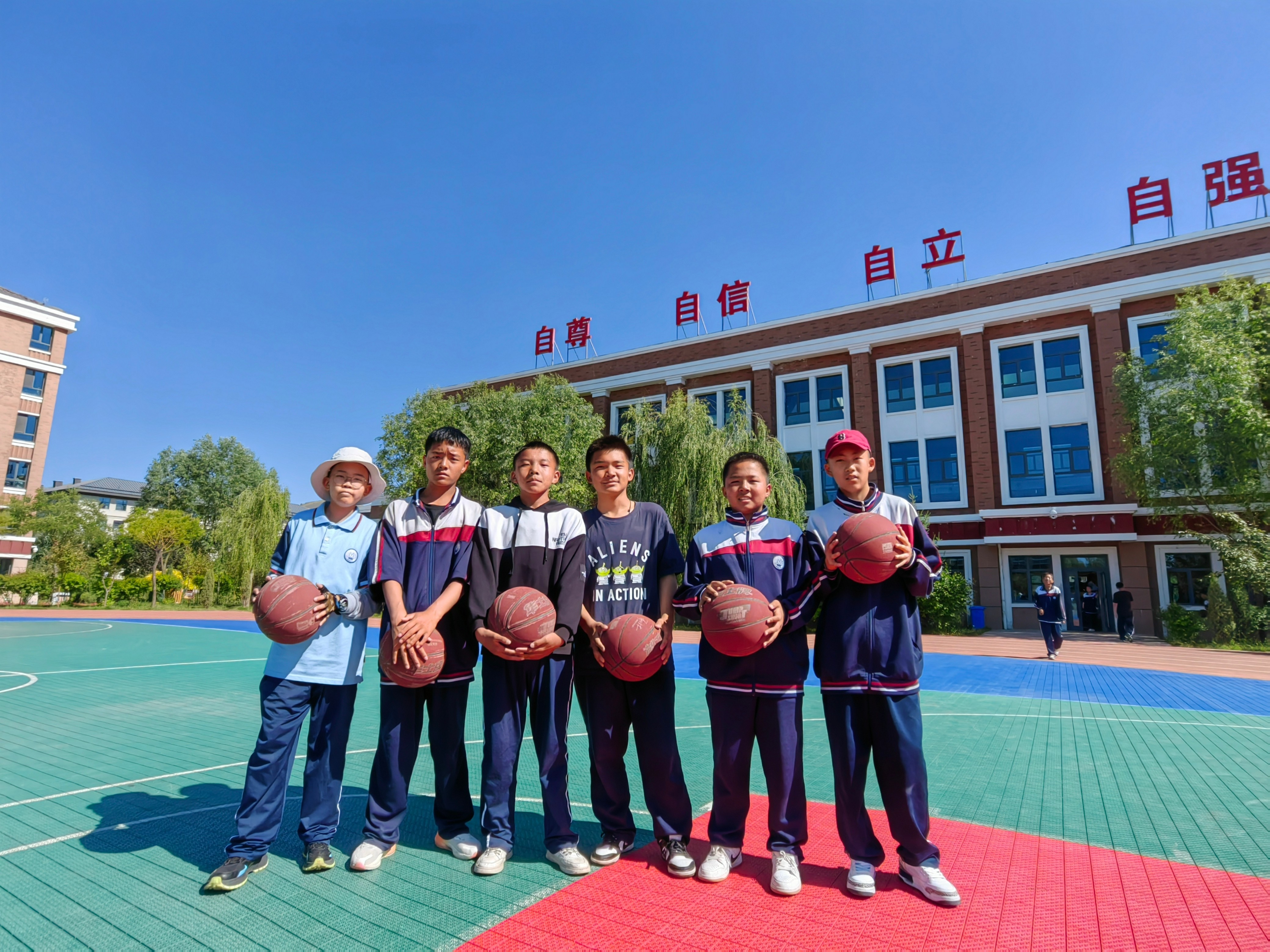 初一年级的意智杰(左二)与伙伴们同记者打球后合影,他们健康而又阳光。(摄影:冯济东)