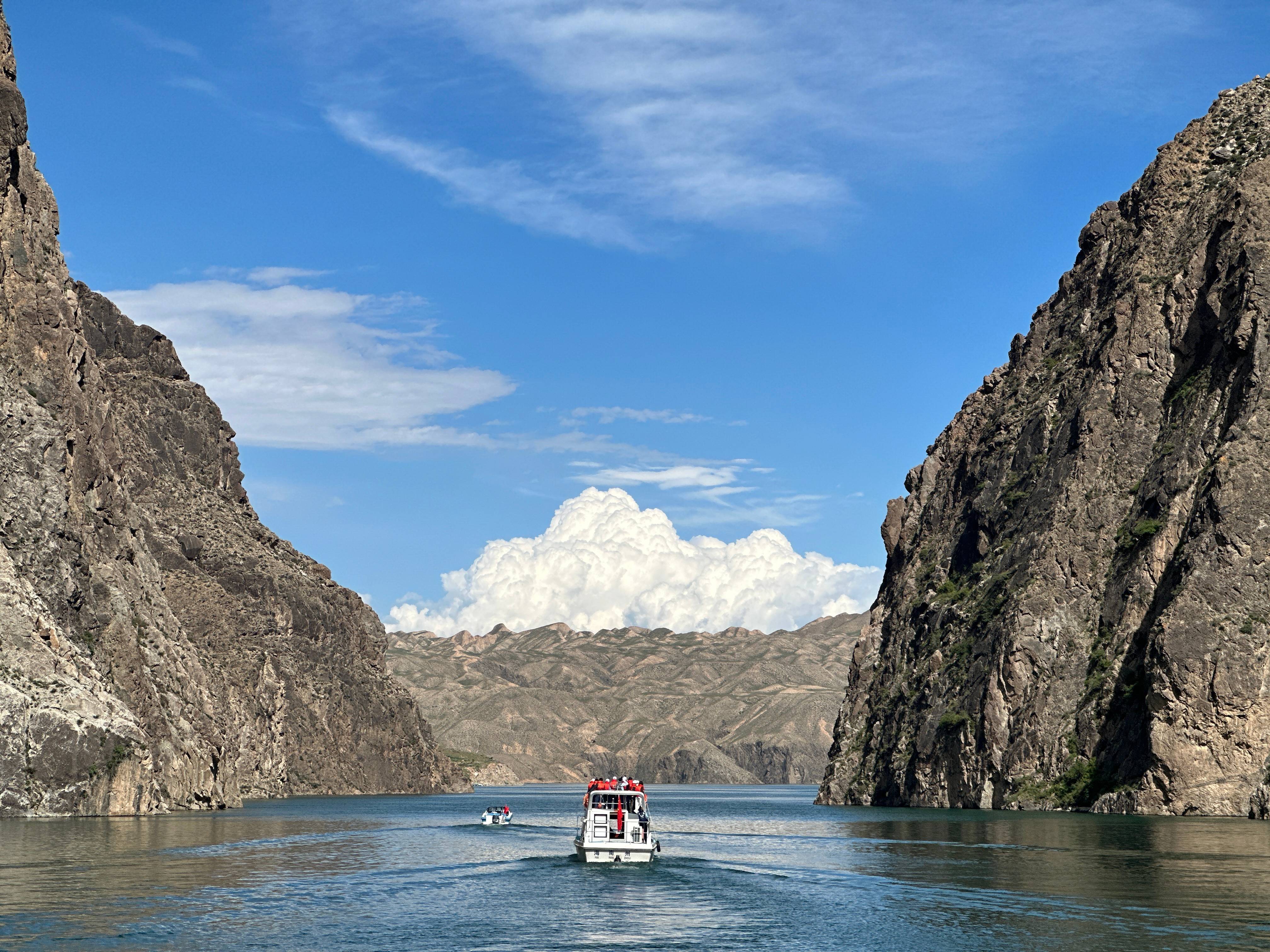 如今的龙羊峡,建成了生态旅游景区。高处俯瞰,水色缥碧,宛若翡翠;舟行碧波,两岸连山,略无阙处。金雕翱翔在天际,岩羊腾挪于峭壁。