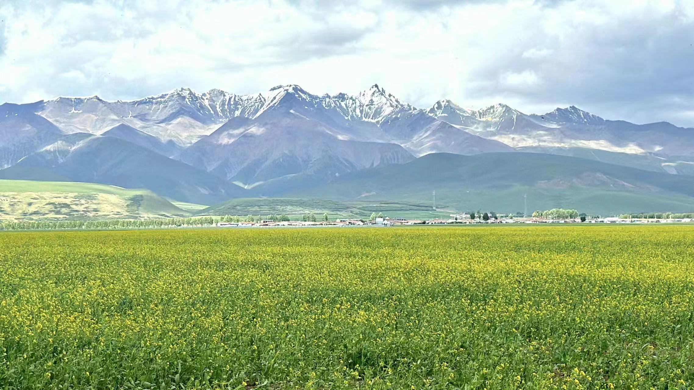 门源回族自治县百里油菜花海在雪山脚下灿烂盛开。(摄影:俞怡琦)