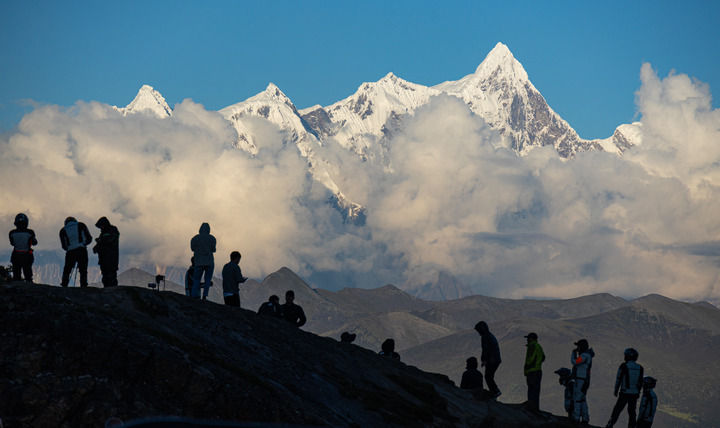 游客在色季拉山口的川藏公路边观赏南迦巴瓦峰风光(2023年9月5日摄)。新华社记者 丁增尼达 摄
