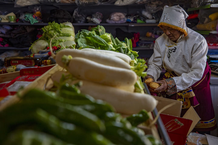 在西藏那曲市申扎县马跃乡贝嘎四村偏远乡镇果蔬配送试点项目直销点,店主西热加措在整理供销合作社配送来的新鲜蔬菜(2024年1月5日摄)。新华社记者 姜帆 摄